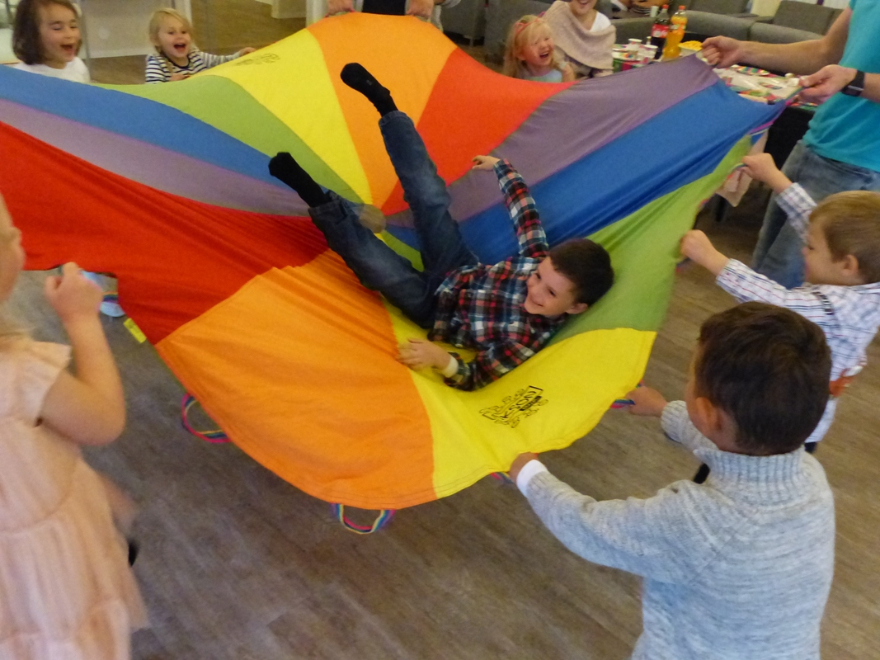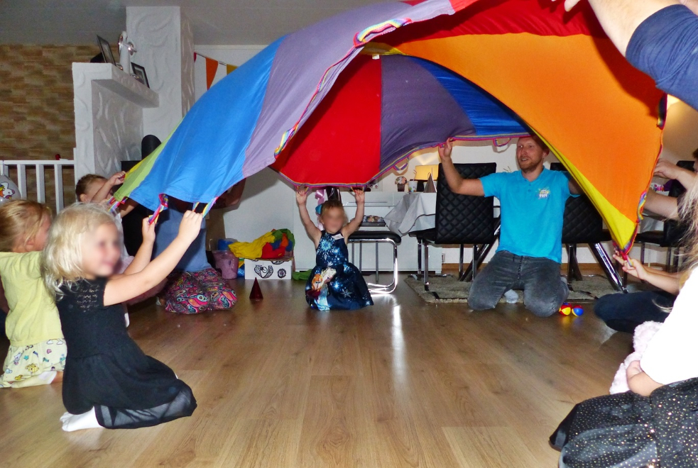 Leker og konkurranser med fallskjerm og leketunnel er kjempeunderholdning for barn og voksne. Stor fallskjerm og lang leketunnel, takket være deres størrelse og lyse farger, trekker til seg mye oppmerksomhet og vekker stor interesse hos alle festdeltakerne. Våre underholdere finner alltid på mange gøye aktiviteter med de to tingene, både inne og ute. De lekene utvikler barnas fantasi, lærer dem å samarbeide og påvirker positivt barnas motorikk. Det er en utmerket aktivitet for barn som ikke liker å sitte i ro. De krever god utholdenhet, men det har jo alle barn :-). Fallskjerm og leketunell anbefaler vi spesielt til barnebursdager, bryllupsfester, bedriftsfester og til forskjellige arrangementer i barnehager.